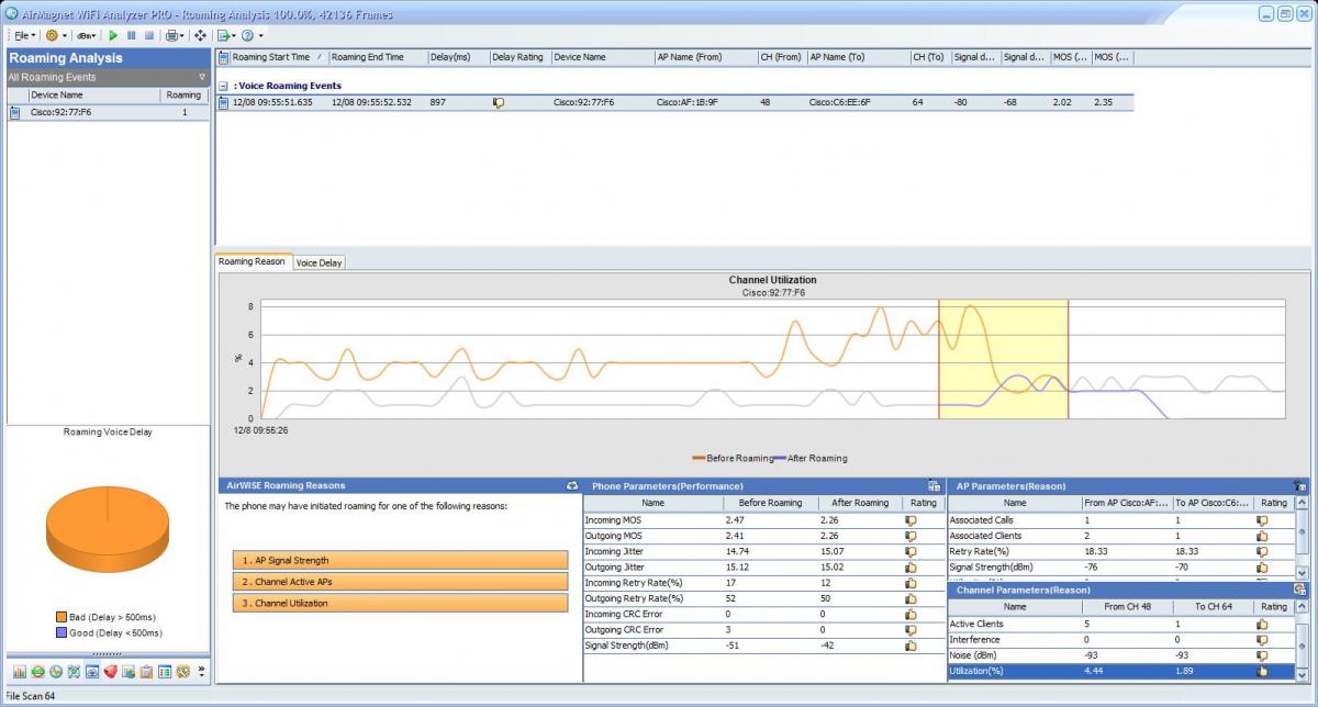 無(wú)線技術(shù)的一個(gè)益處就是為用戶帶來(lái)移動(dòng)性,而且在典型的環(huán)境下,客戶端設(shè)備預(yù)期會(huì)在多個(gè) AP 甚至網(wǎng)絡(luò)邊界之間漫游。對(duì)于任何部署來(lái)說(shuō),保證流暢的漫游,不要出現(xiàn)通話或會(huì)話中斷,并以用戶無(wú)法察覺(jué)的方式進(jìn)行切換具有重要意義。AirMagnet WiFi Analyzer PRO 支持將多個(gè) WLAN 適配器連接到計(jì)算機(jī)中來(lái)解決客戶端的漫游問(wèn)題—這一 IT 人員常見(jiàn)的 WLAN 網(wǎng)絡(luò)問(wèn)題。
